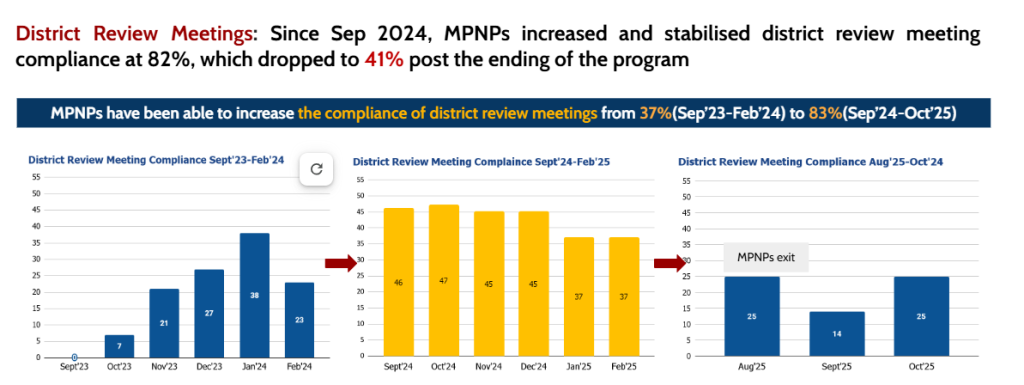 Cumulatively, these changes strengthened the last-mile delivery of NIPUN interventions. Tighter monitoring, faster resolution of material bottlenecks and consistent follow-up improved execution reliability. The MPNP Fellowship also produced a clear demonstration effect. Madhya Pradesh’s approach has informed the design of similar district-level FLN fellowships in other states, including Odisha, showing that embedded professional capacity can improve mission delivery without creating parallel structures or weakening state systems.