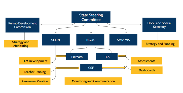 Government systems are dynamic and complex, requiring sustained political and bureaucratic commitment, shared accountability and clear prioritisation of initiatives for reforms. In order to ensure that FLN remains the highest priority among other initiatives, a highly empowered State Steering Committee was instituted in November 2023. The committee comprised key state stakeholders, a Punjab Development Commission member and representatives from the education department and civil society organisations (CSOs). While the State Council of Educational Research and Training (SCERT) and Central Square Foundation (CSF) serve as the Project Management Unit, Pratham and The Education Alliance are academic and technical partners for this. This steering committee with a diverse set of highly empowered individuals meet weekly to gather feedback and make data driven decisions in a consultative manner.