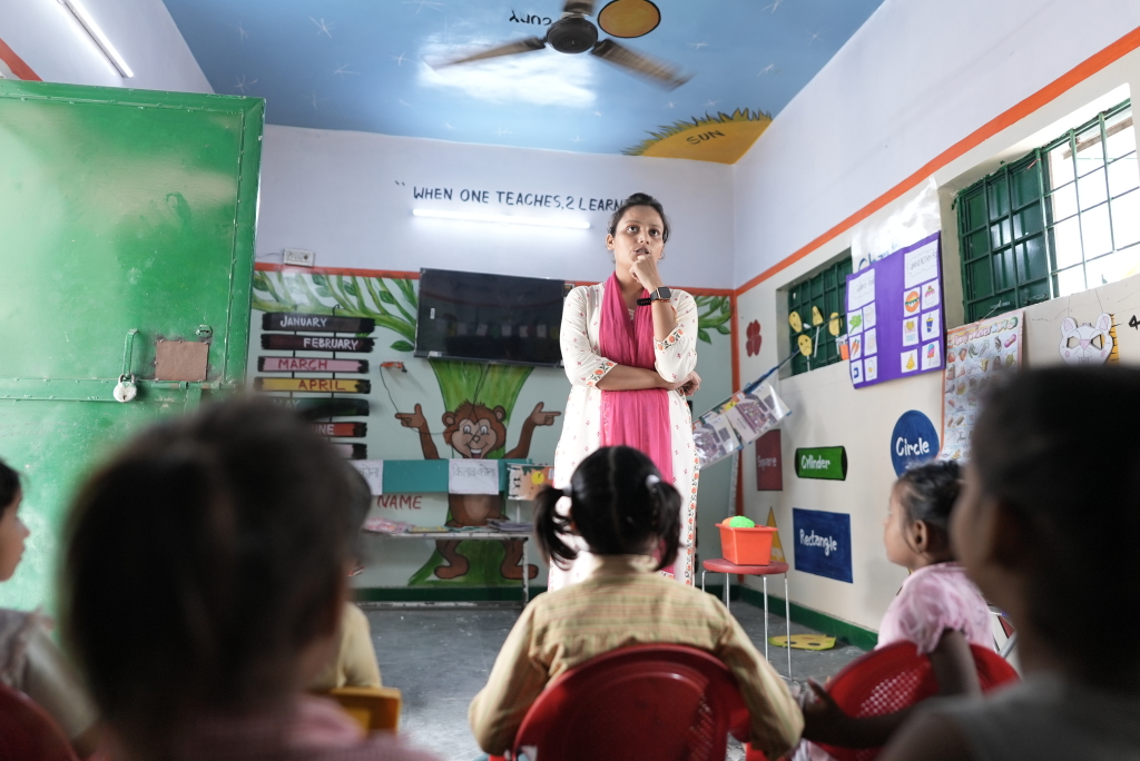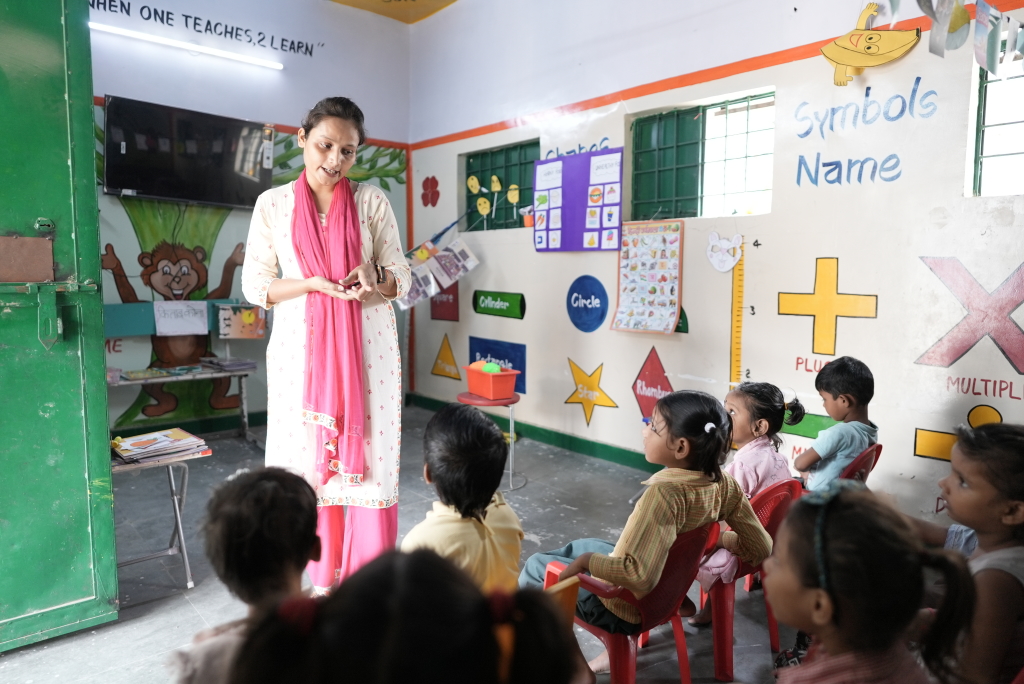 Nidhi Sharma is a trained Early Childhood Care and Education (ECCE) educator who specialises in pre-primary education. She joined the school as an ECCE educator in June 2025, under the newly launched programme by the Department of Basic Education, Uttar Pradesh. This programme aims to provide focused attention towards preparing young children for formal schooling She teaches a class of about 15 children, aged 5–6 years, with sessions held from 9AM to 1PM.