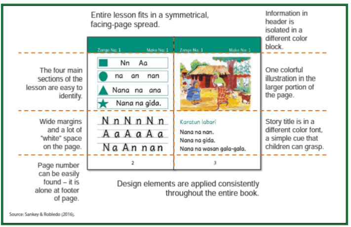 - Easy to process Page design: Placing illustrations with the text in readers, using a large font, and limiting the words per sentence/line/page.(See figure 9)